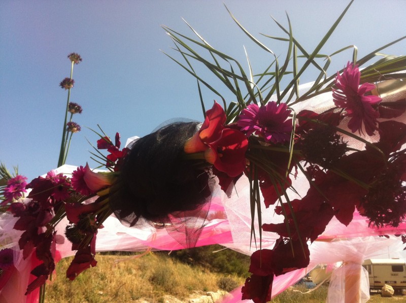 arche nuptiale à base de bambous et voilage de tulle blanc et rose