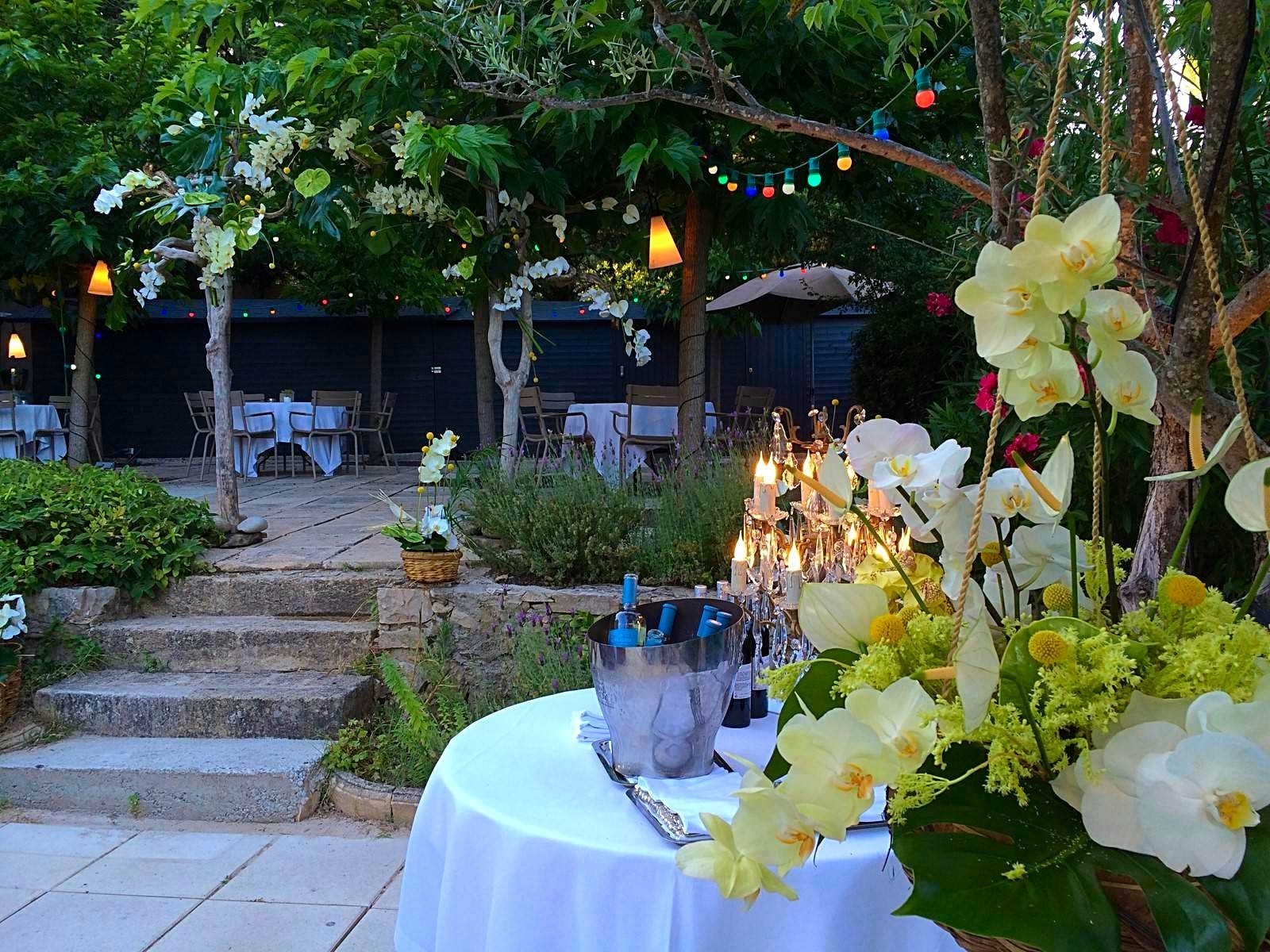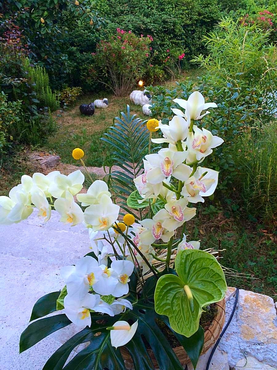 Pour cette occasion, une arche exotique accueille les invités pour les guider dans un univers luxuriant où des inflorescences généreuses chutent en cascades. Une très belle collection d'orchidées phalaenopsis, cymbidiums, vandas et de fleurs exotiques anthirium est choisie dans les couleurs de blanc, jaune et vert.