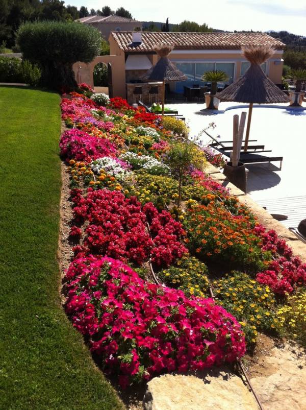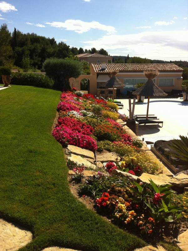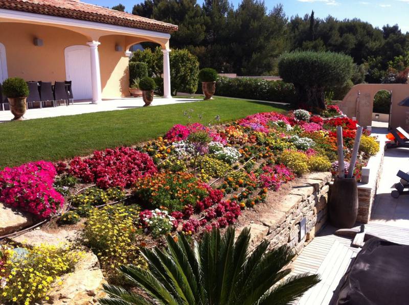 Conception réalisation paysagère de vos massifs floraux et arbustifs de facades d'entreprises, de restaurants, d'hôtels, d'entourage de piscine, de terrasse et de parking de magasins et cabinets, nous dessinons, créons vos massifs de fleurs et de vivaces selon l'air du temps. Notre équipe de jardiniers réalisent les plantations de tous types de jardins au sol ou suspendus dans toute la région paca