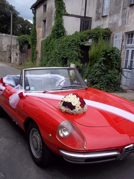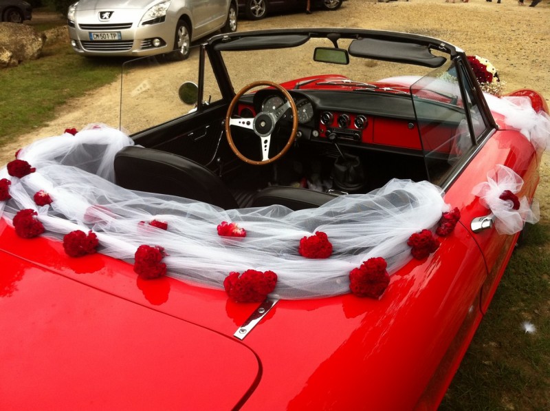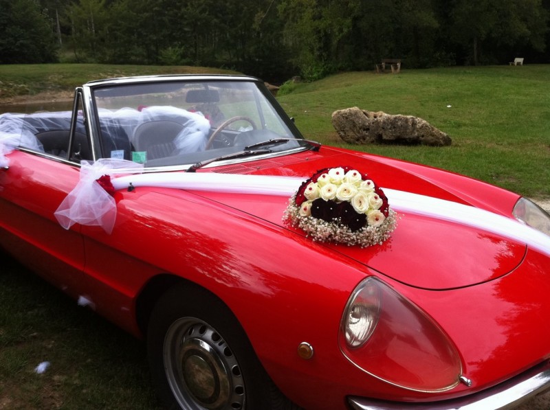 En harmonie avec la voiture, le bouquet sur la voiture de cortège des mariés ouvre le thème dans les couleurs du mariage