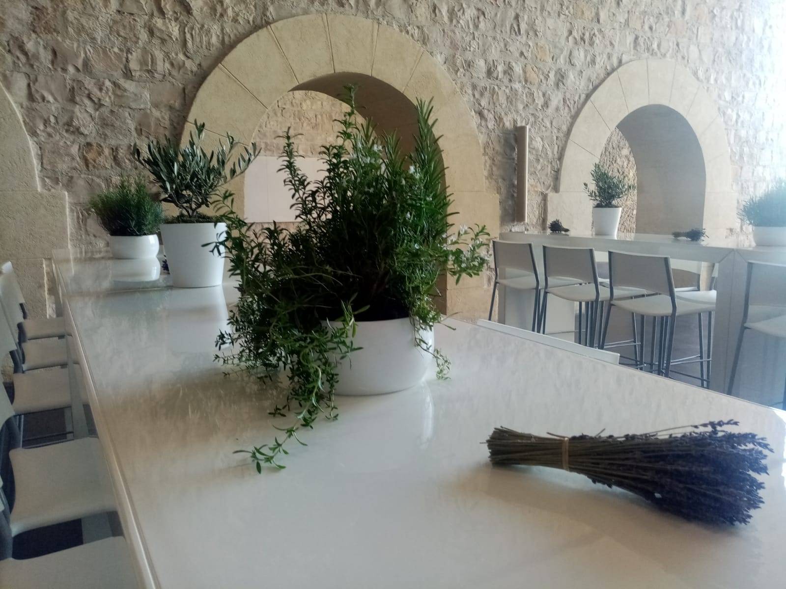 Les petits oliviers en pots en terre ou en céramique font très bon ménage avec les potées et les coupes d'aromates.
