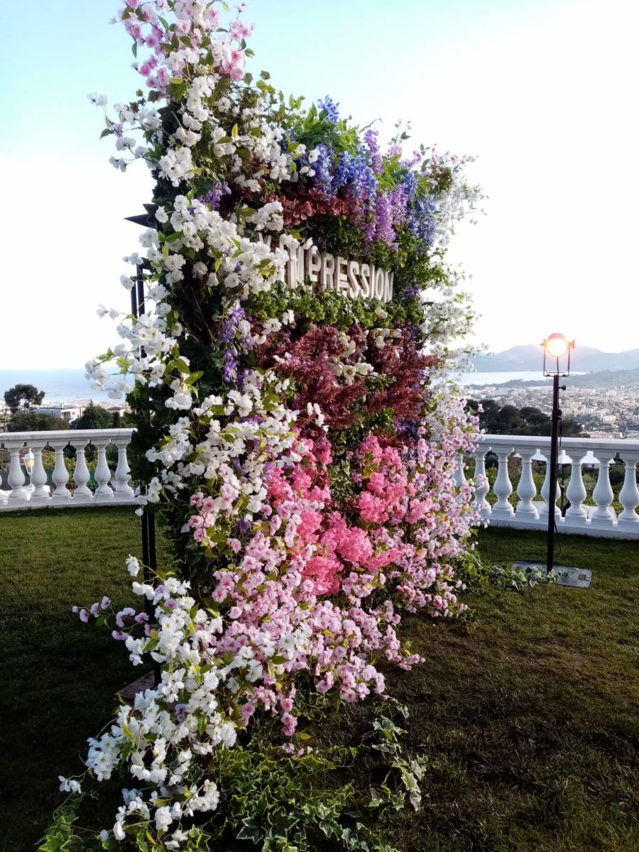 Le mur de fleur à la location a été réalisé sur une base autoportante entièrement recouverte de mousse végétale naturelle en plaque ponctuée harmonieusement de fleurs pour obtenir ce magnifique résultat qui a conquis tous les invités à cette soirée de présentation de parfum pour le Festival de Cannes 2024.